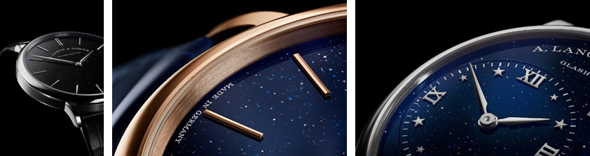 朗格曾推出黑色和銅藍色兩種各具魅力的砂金石玻璃錶盤,呈現同中求異的兩種視覺效果。實心銀錶盤上包覆一層纖薄的砂金石玻璃,內含微小的銅色顆粒,隨着光影的變化而綻放閃爍光芒,宛如星光熠熠的夜空。這種珍貴材質的製作過程起源於 17 世紀的威尼斯。銅顆粒被灌注到熔化的玻璃中,隨着加熱時火焰逐漸減弱,這些銅顆粒會形成微小的晶體。要在錶盤上使用這種材質,必須謹慎地將其澆注到實心銀錶盤之上,盡顯朗格的頂尖工藝技術。不論是以簡約為主的 SAXONIA THIN 腕錶, 或是配備月相功能的 LITTLE LANGE 1 MOON PHASE,微小的閃亮顆粒在黑色或深藍色錶盤上隨著光影的變化呈現銅色光澤,讓錶盤成為一幅令人着迷的星空圖畫。