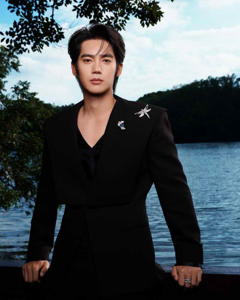 于適胸前兩枚胸針相映成趣,為整體造型注入盎然生機與敘事感。