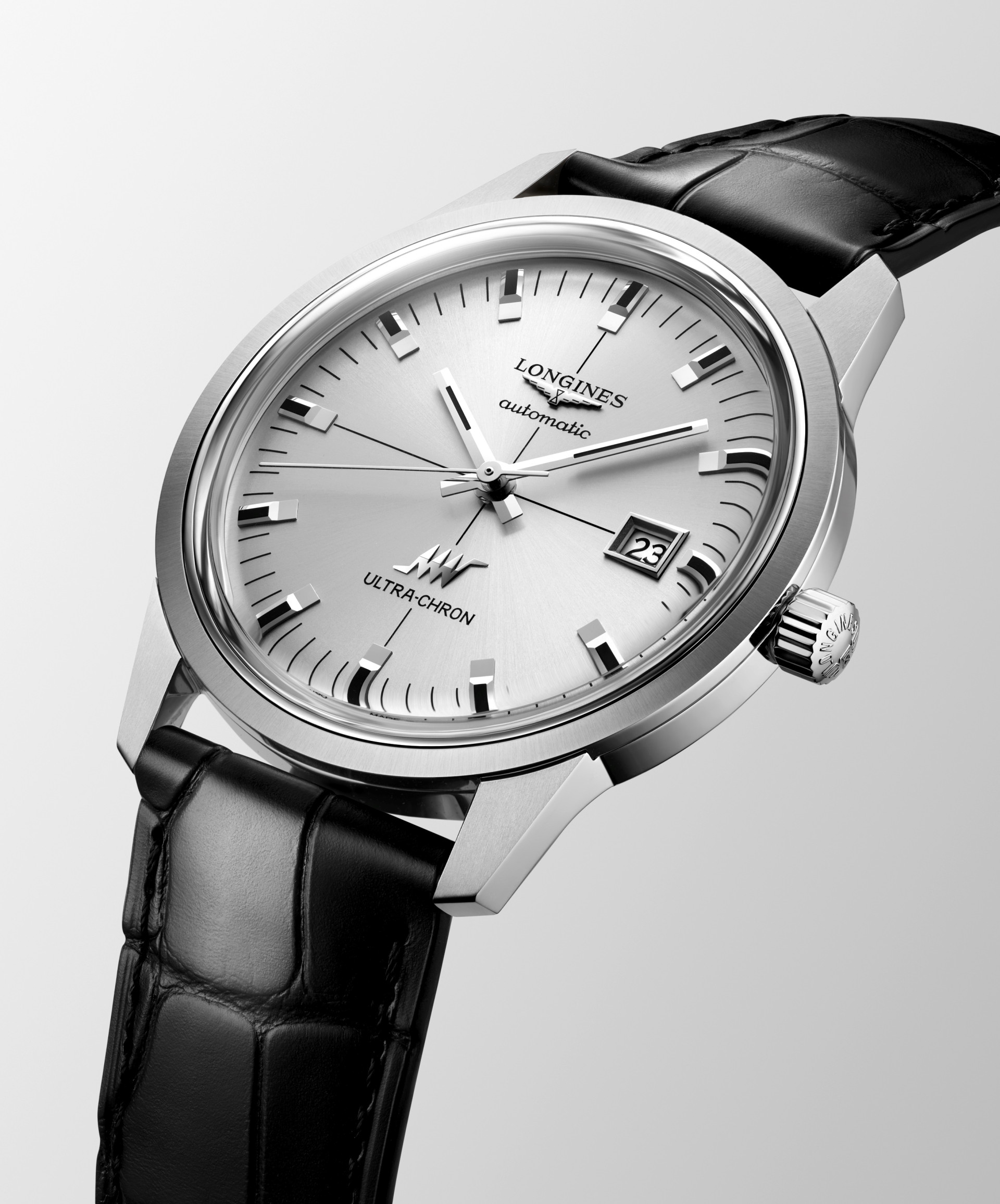 2025年,浪琴表重溫這款經典,並將之重新詮釋為符合當代佩戴的實用性要求。全新Ultra-Chron Classic腕錶保留前代作品的獨特設計特色,其弧形銀色太陽放射紋錶盤閃耀發光,呈現與原版錶款如出一轍的精緻優雅。而鑲貼的銀色拋光時標與指針延續其細膩的工藝手法重現經典美學,獨特的梯形3點鐘位置日期視窗,採用與原版Ultra-Chron腕錶相同的復古日期字體增添復古韻味,加上提升至5巴的防水深度,提供實用卻又不影響此錶的雋永時尚風格。