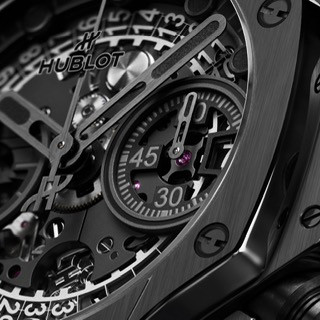 腕錶採用 42 毫米黑色陶瓷錶殼,結合緞面與拋光處理,勾勒出 Big Bang 系列標誌性的幾何輪廓。全黑陶瓷不僅呈現俐落純粹的極簡美學,更彷彿披上一襲神秘的高級訂製黑衣,散發哥德式深邃、冷冽的當代態度。