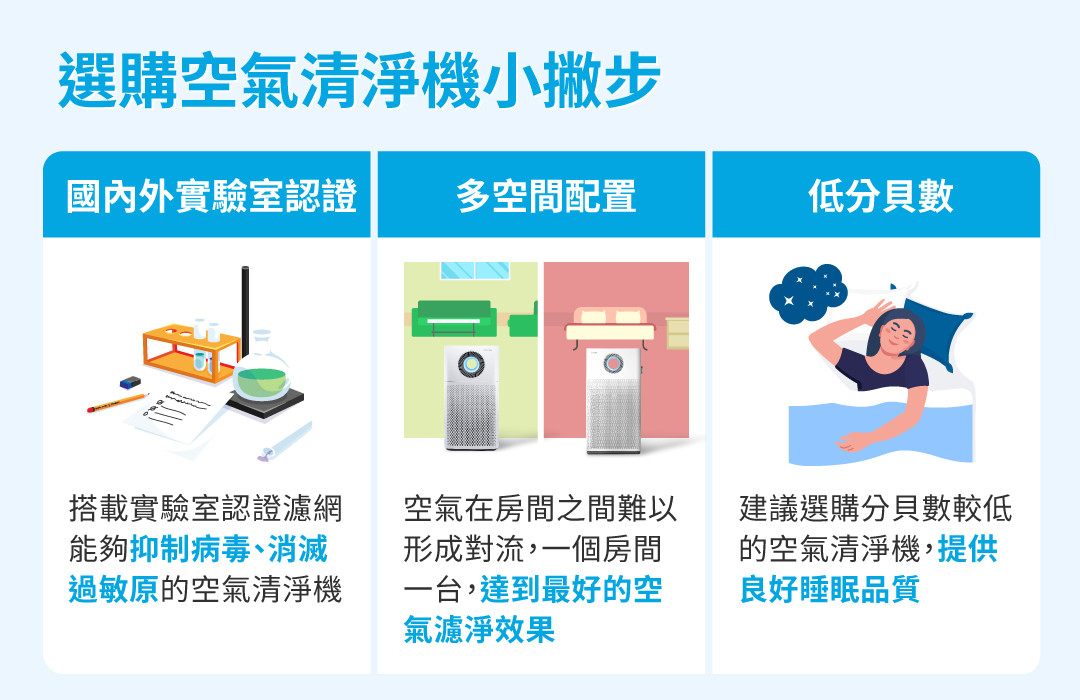 使用空氣清淨機三要點:擁有國內外實驗認證、擁有低分貝數,同時建議採多空間配置才能達到好的濾淨效果(王貫寧 提供)