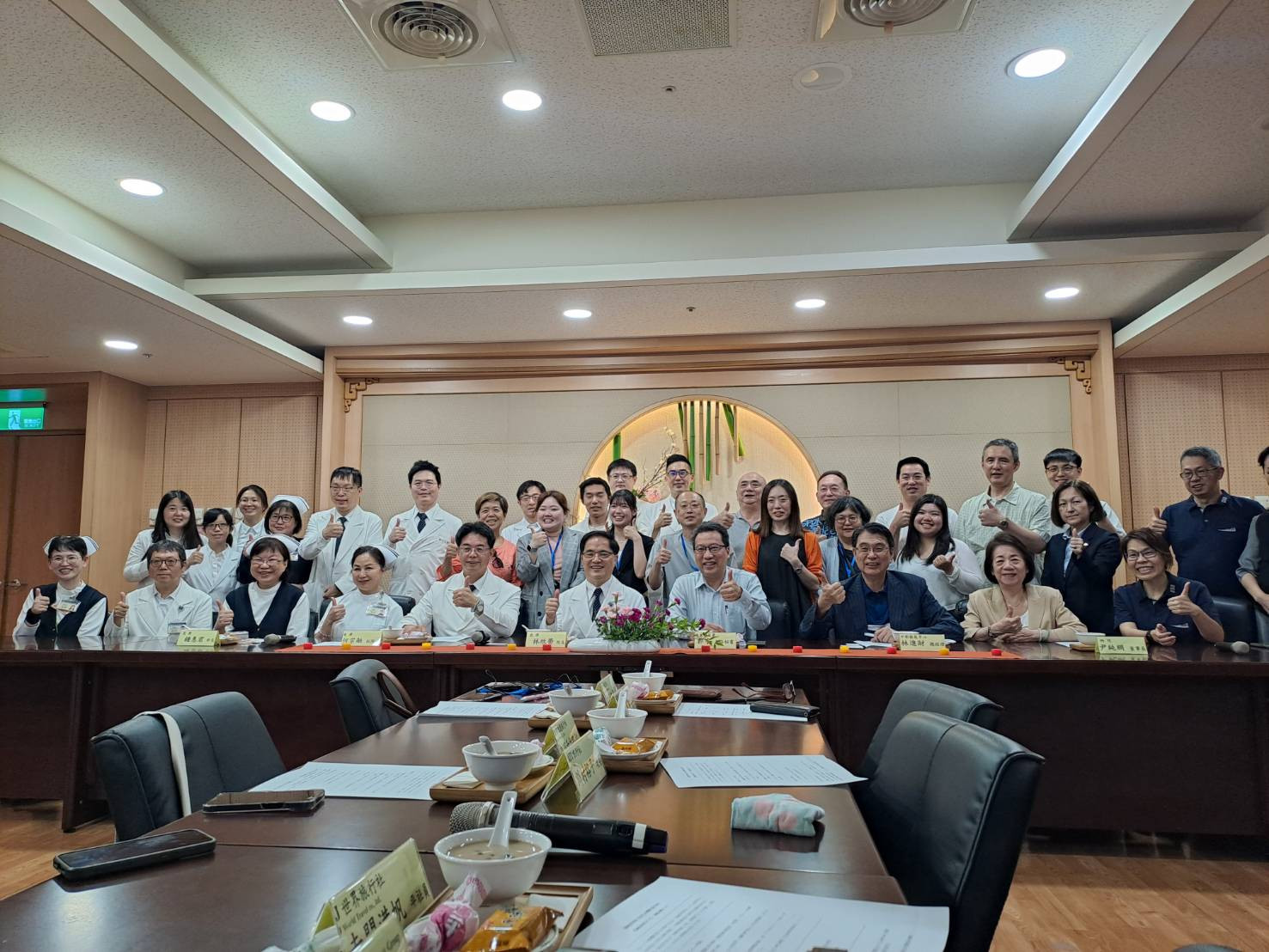 圖說:花蓮慈濟醫院團隊作完簡報大和照,(前排右二至右六)君達集團董事長尹純綢、中衞發展中心總經理林進財、經濟部商業發展署的主任秘書郭宇、花蓮慈濟醫院林欣榮院長、花蓮慈濟醫院何宗融副院長。(圖/花蓮秧悦美地度假酒店提供)