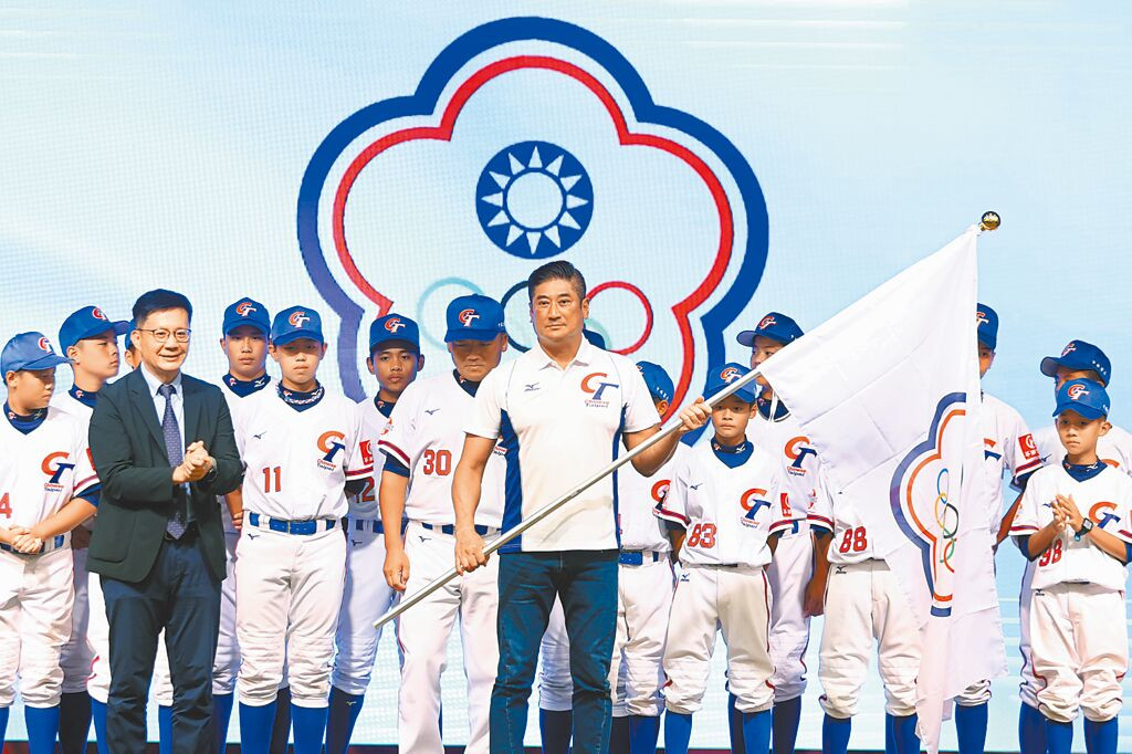 中華棒協14日舉辦史上首次中華隊三級棒球成軍誓師大會,棒協理事長辜仲諒(中)親自授旗加油。(鄧博仁攝)
