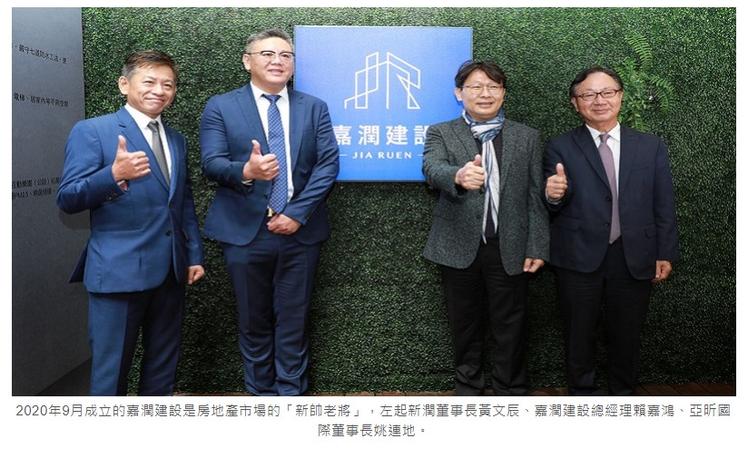 嘉潤建設是房地產市場的「新帥老將」,2020年9月成立的建設公司,是房地產的「新帥」,但是,這家公司成員都是擁有20年資歷以上的房地產老將,具備豐富的實際開發、規劃、興建、銷售的專業,包括上櫃建商新潤建設機構董事長黃文辰、亞昕國際董事長姚連地,新潤興業董事長郭長庚及賴嘉鴻總經理,這4位房地產大老合起來「百年功力」傾注在嘉潤建設,2年時間,已經在新北市推出2件銷售與口碑都極佳的「嘉潤青翠」、「久云嘉潤日出」建案,2022年更進軍台北市,取得民生東路、吉林路口「嘉潤一御」危老重建案,短短2年時間「戰功彪炳」,成為房地產被高度注意的焦點。