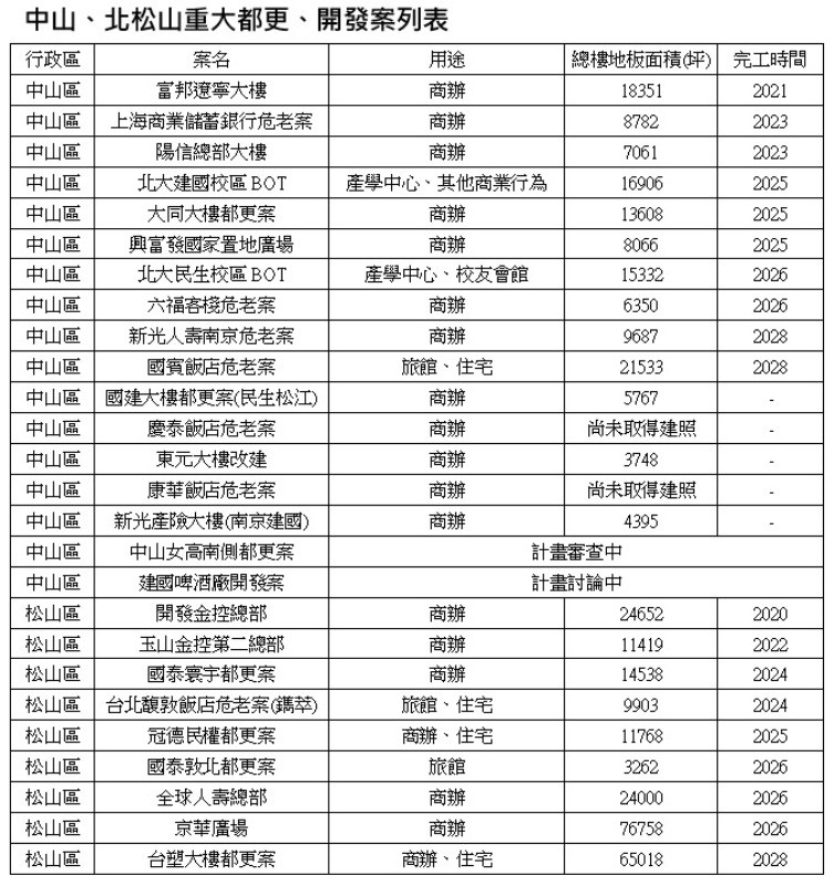 中山北松山這區內有富邦、新壽、上海商銀、大同大樓、玉山金、開發金、全球人壽、台塑、京華城等金控和大型企業集團所主導的重量級A辦都更,帶來龐大的新就業人口購屋需求;亦有國賓、馥敦的新形態飯店寓所創造新價值,未來民生東路西華飯店改建豪宅身價,也有望受「國賓皇琚」200萬行情拉抬。