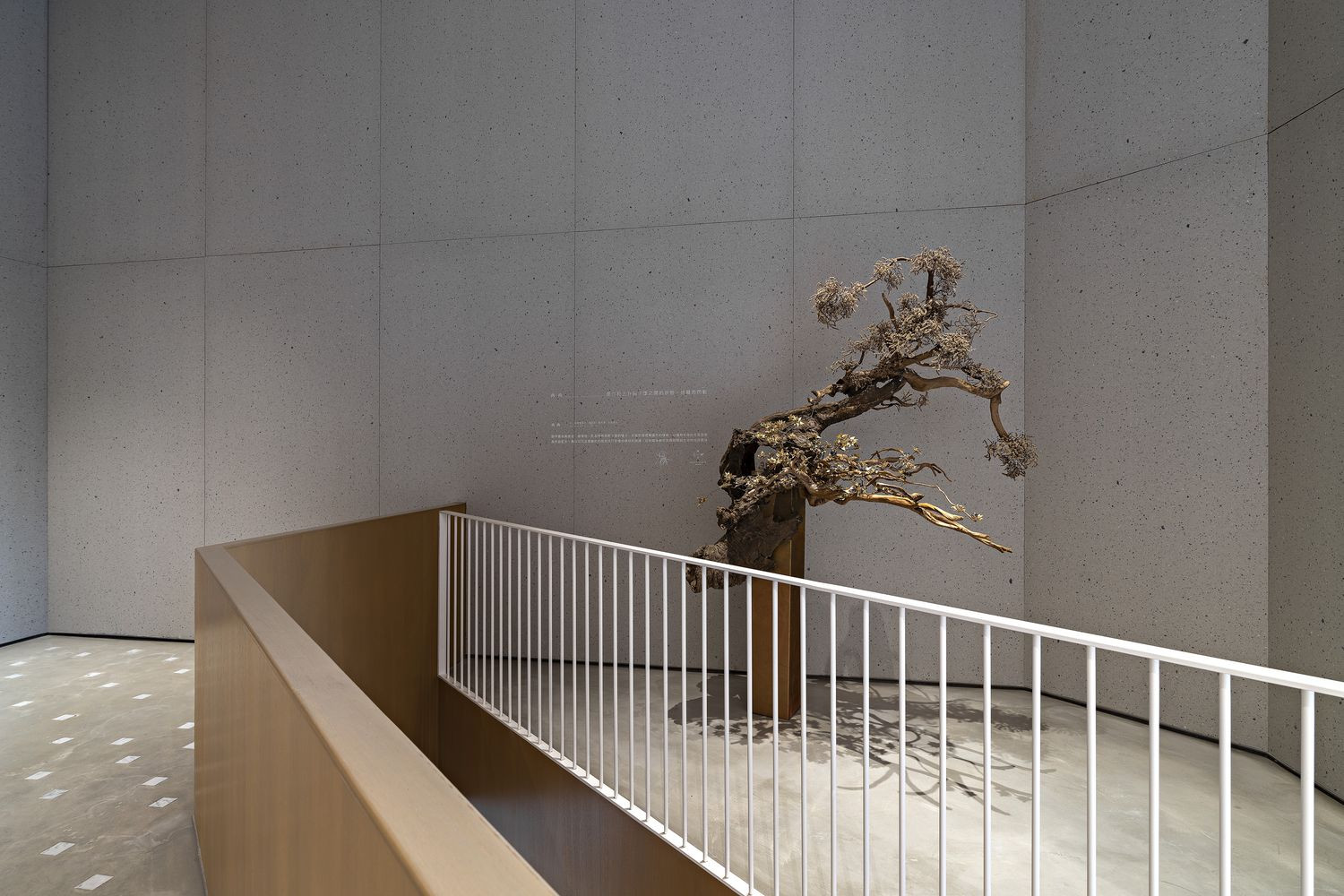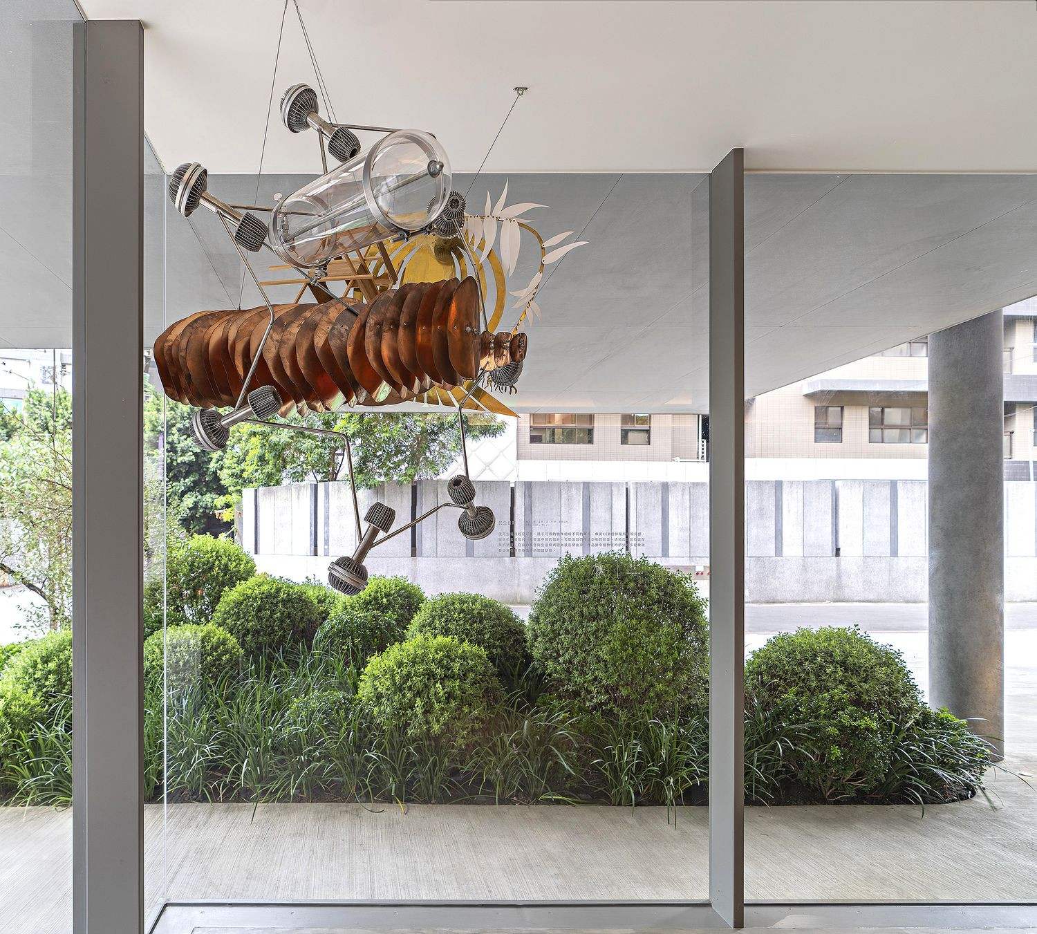 為提供消費者沈浸式體驗,接待中心的內部設計納入「衡沐」與環境融合的詮釋角度,邀請「質物霽畫」主理人、藝術家李霽,針對個案規劃核心發想創作,透過三件藝術作品傳達自然觀點,梳理生命與萬物生態的運作。接待中心入口處的懸吊作品,由銅、鐵、木材等複合媒材所製作的「民生日常」藝術品,反映建築基地位處市中心的生活型態;進到二樓視聽室,則有如雲朵般無重力漂浮的「光子」,作品有機漫佈於空間場域中,交融多媒體視覺、透過銀網材料折射光線,共振出生命和自然的協調平衡。而隱身在二樓樓梯側,以仿擬植物生長型態的作品「冉冉」,展演時間與生命的關係,更是直接呼應KTA自然建築的永續理念。