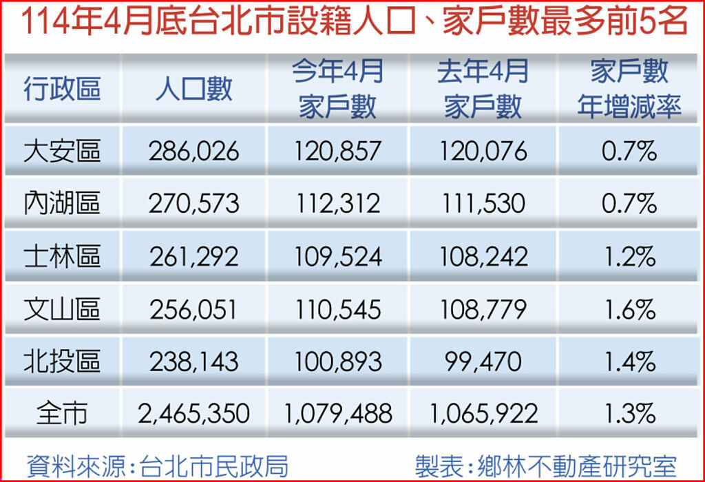 根據台北市民政局資料顯示,今年截至4月底止,北市設籍人口數246萬5350人、家戶數107萬9488戶,其中人口數和家戶數最多的前五大行政區,分別是大安區、內湖區、士林區、文山區以及北投區,與去年4月底數據作比較,家戶數年增率以文山年增率1.6%最高;北投1.4%次之,士林1.2%居第三。