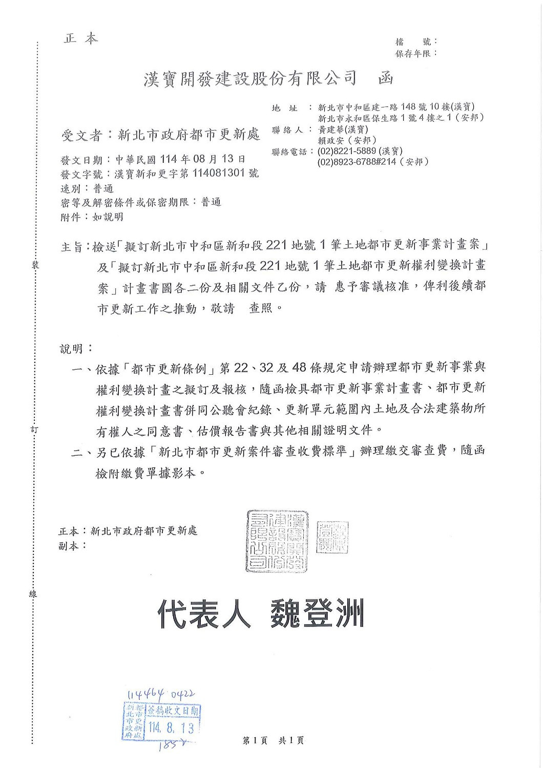 該都更案早在十年前曾由多家上市知名建商嘗試整合,但因多重因素未能成功,住戶嘆息多年。直到113年底漢寶建設以在地建商,秉持服務精神正式入場整合,展現高度專業與讓利誠意,僅用3個月,於114年2月,便取得91%住戶同意比例,114年7月完成全體住戶選屋程序及達成100%的住戶同意比例,並於8月13日以100%都更同意事權併送的方式正式向新北市政府都更處報核。