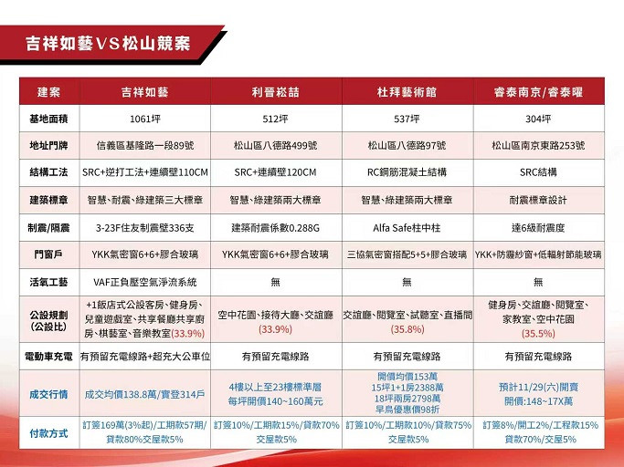 「吉祥.如藝」代銷公司全地產黃楷鈞執行長表示:誠如房市歷來的發展軌跡:重大建設與都更不會等消費者準備好才開始,一旦建設完工落地,房價只會再往上!目前信義計畫區與周邊鄰近的房市區塊房價比較,信義計畫區2-3房的新推案普遍站上180~200萬/坪,松山區八德路、南京東路上2-3房預售案每坪開價也來到170萬,「吉祥.如藝」距離捷運市府站步行約7-10分鐘,目前景觀保留戶也才每坪140多萬,可以說是市府站周邊少見的「甜蜜價」,現成價差相當於就是"獲利入場"!