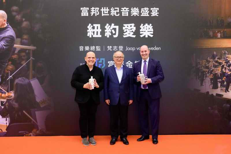 富邦金控總經理韓蔚廷(中)致贈紐約愛樂交響樂團執行長Gary Ginstling(右)及音樂總監梵志登(左)由富邦藝術基金會設計製作的洪易鴨杯,表達富邦對音樂家及幕後團隊的感謝之意。