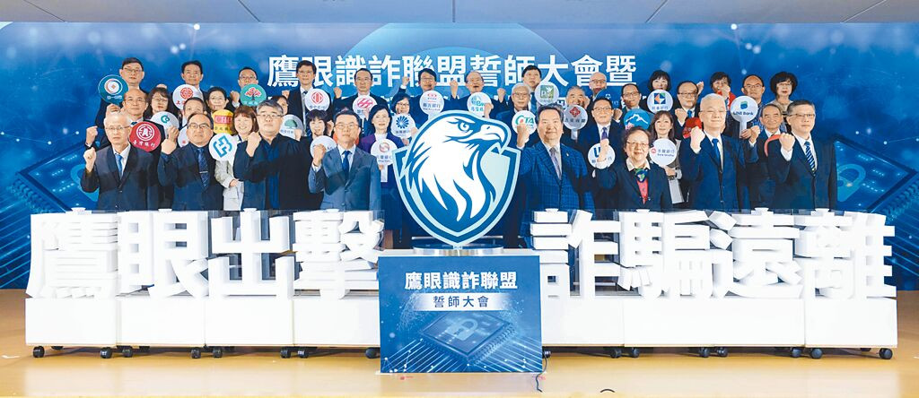行政院打詐辦公室、內政部警政署刑事警察局、金管會、台北市政府警察局及台北富邦銀行等32家銀行,16日共同舉辦「鷹眼識詐聯盟」誓師大會,攜手宣示反詐決心。 (台北富邦銀行提供/洪凱音台北傳真)