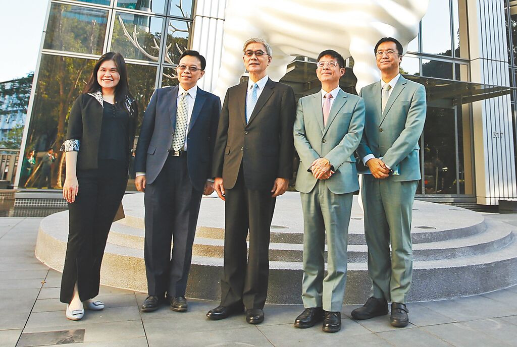 第二屆永續金融先行者聯盟啟動記者會14日盛大舉行,玉山金控兼玉山銀行董事長黃男州(右二)會後為金管會主委黃天牧(中)導覽玉山金控第二總部。(杜宜諳攝)