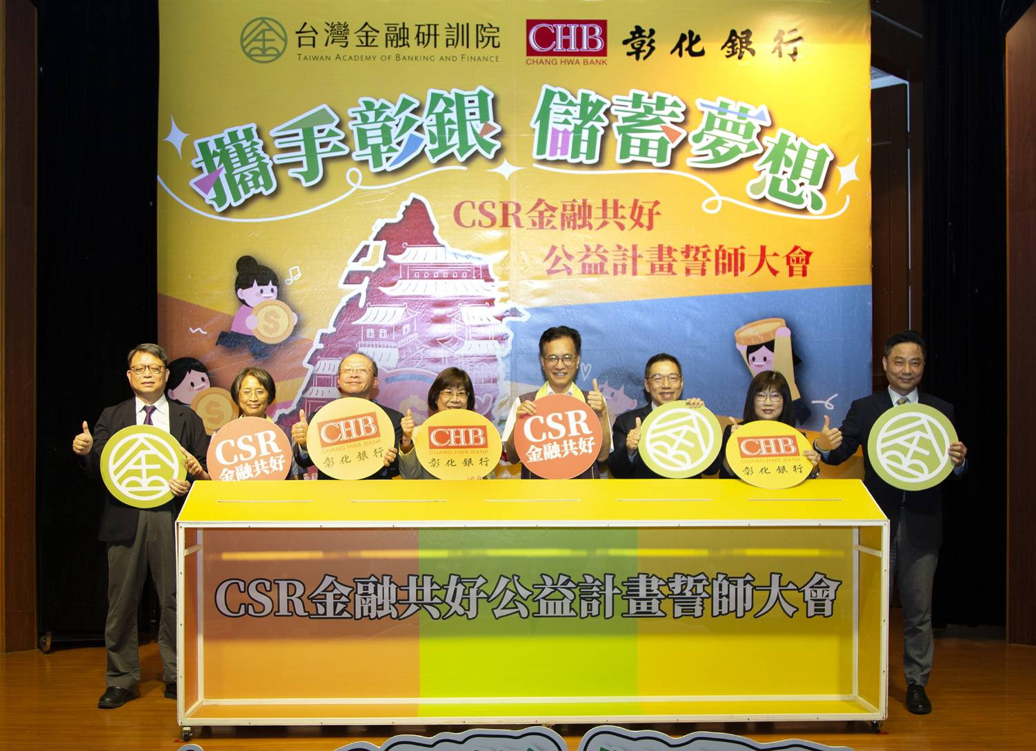 彰化銀行與台灣金融研訓院攜手推動「金融共好公益計畫」,10日舉辦誓師大會,扎根金融素養教育。圖由左至右為,國立彰化師範大學教授鄭國枝、彰化縣政府教育處副處長張淑珠、彰化銀行總經理周朝崇、彰化銀行董事長凌忠嫄、彰化縣政府副縣長林田富、台灣金融研訓院院長黃崇哲、彰化銀行副總經理鄧秀娟、台灣金融研訓院院務委員鄭翰。