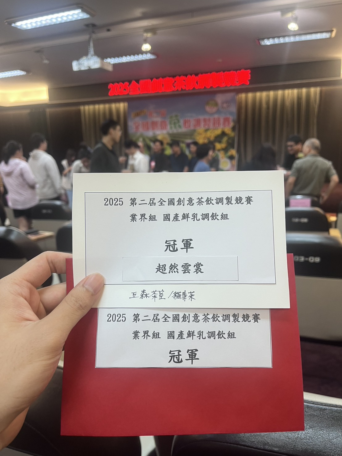 由農業部茶及飲料作物改良場與大葉大學共同主辦之「2025第二屆全國創意茶飲調製競賽」圓滿落幕。在眾多業界品牌的角逐中,來自苗栗的在地品牌【丘森茶室】脫穎而出,憑藉作品《超然雲裳》榮獲「國產鮮乳調飲組」冠軍;《桂語檸歆》則獲茶飲組佳作。