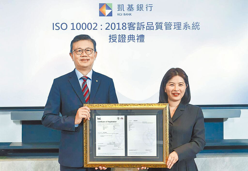 凱基銀行17日宣布榮獲國際權威第三方機構-英國標準協會(BSI)「ISO 10002:2018客訴品質管理系統」認證,肯定落實公平待客及與國際接軌的客戶服務水準,並將持續以高度承諾守護客戶權益與服務品質,專注傾聽客戶需求,並運用創新科技,打造更高品質、更高效率及最佳便利性服務。