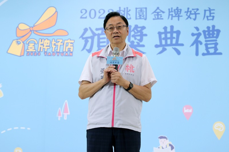 桃園市長張善政與得獎店家互動。