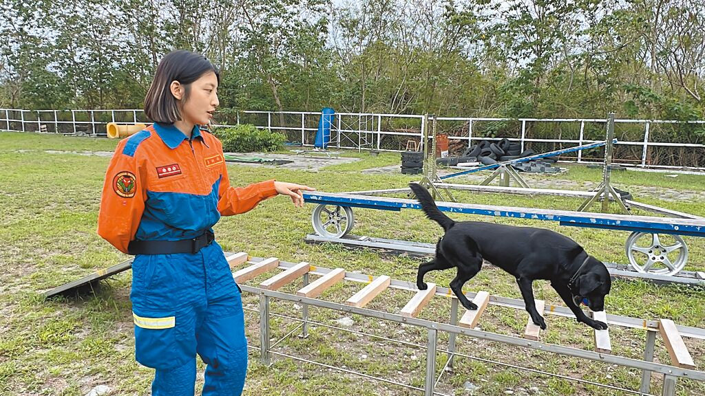 台東縣消防局搜救犬小組領犬員李妍鈞與通過國際IRO瓦礫初級評量黑拉不拉多犬Jodie,正在執行日常訓練。(蔡旻妤攝)