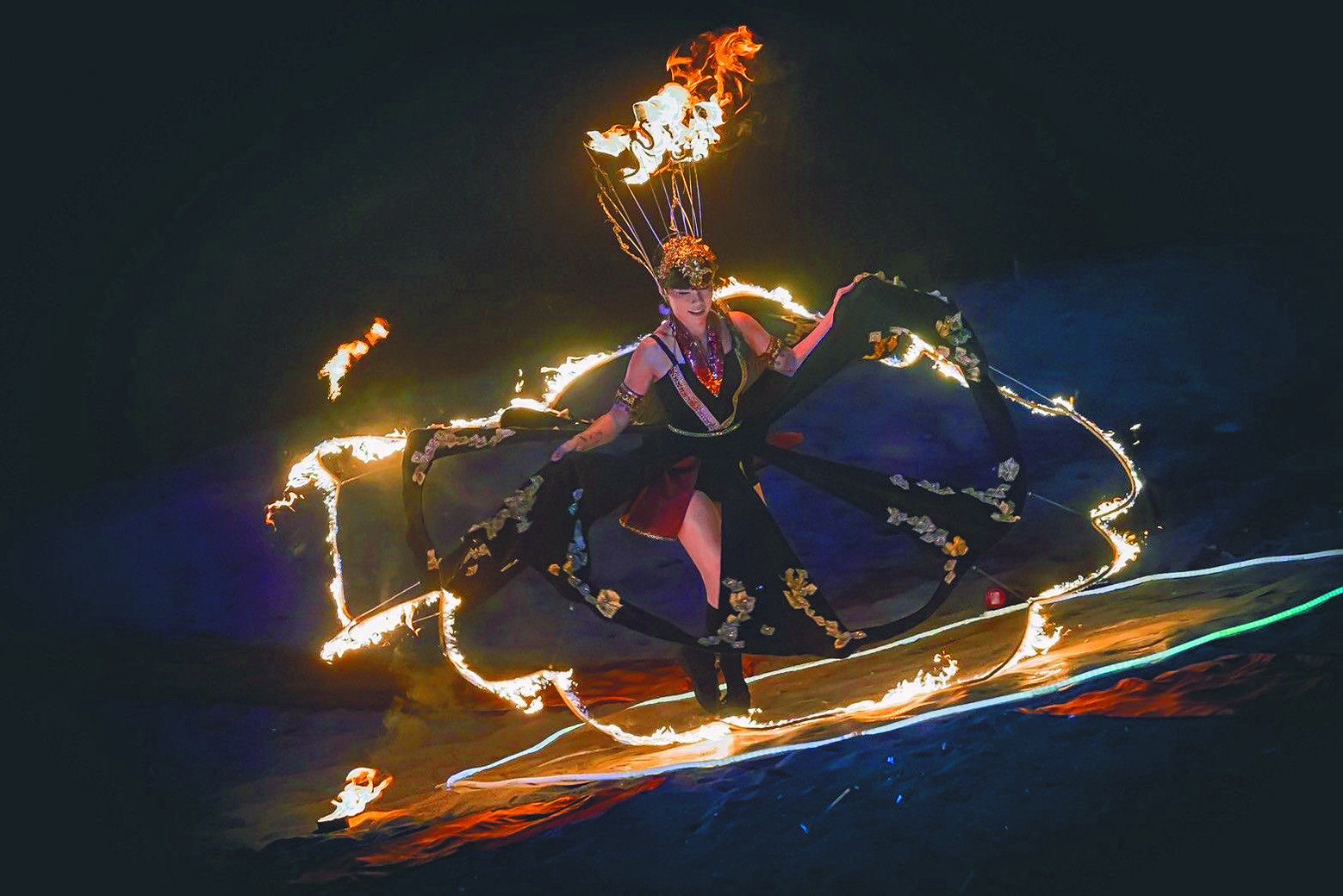 新北市辦理「北海夜金閃閃-2024北海潮與火」活動,在金山區中角灣國際衝浪基地推出火舞表演與「青農火BBQ派對」,中山溫泉公園則推出「仲夏.星光影院」,以雙主場活動模式,展出3組創作作品。 (柯毓庭攝)