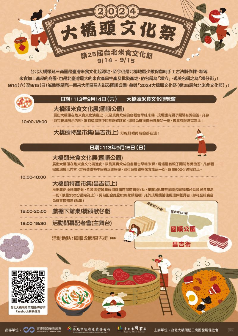 臺北市商業處輔導台北大橋頭延三商圈發展促進會於9月15日在國順公園旁的昌吉街辦理「2024大橋頭文化祭」;台北大橋頭延三商圈是臺灣米食文化起源地,也因其鮮明特色,極盛時期聚集達上百家米食工廠,生產出各式粿粽及其他米食產品,炊煙裊裊蒸米食之景象處處可見。歷經25年來持續推動臺北米食文化,發揚台北大橋頭延三商圈作為臺灣知名「粿仔街」的歷史傳統,因此有「粿穴」之美名,造就今日大橋頭延三商圈粿仔街的特殊人文基礎與產業特色。臺北市產業發展局陳俊安局長表示,「2024大橋頭文化祭」上午10點開始於活動現場展出富教育意義的「大橋頭米食文化展」,除了大橋頭在地文化演進史的展出外,還有懷舊攤車及親子闖關有獎徵答,以米食俚語、米食歷史等為題,凡答出正確答案即可獲得限量500份的粿糕;同時還有「大橋頭特產園遊會」,展售各式吃喝玩樂商品,於園遊會攤位消費滿百即可獲得集章1點,集滿3點則可至服務台兌換限量250份的粿糕,另為配合推動ESG永續指標,凡於現場攜帶使用環保餐具者,即可免費直接贈送1點,鼓勵消費者自行攜帶環保餐具到場同樂。晚間6點開始還原古早年代在商圈裡盛大舉辦的「戲棚下辦桌」,參與民眾不僅可以品嚐由在地食材製作的辦桌好料,同時還可以欣賞到精采豐富的大橋頭在地歌舞秀。