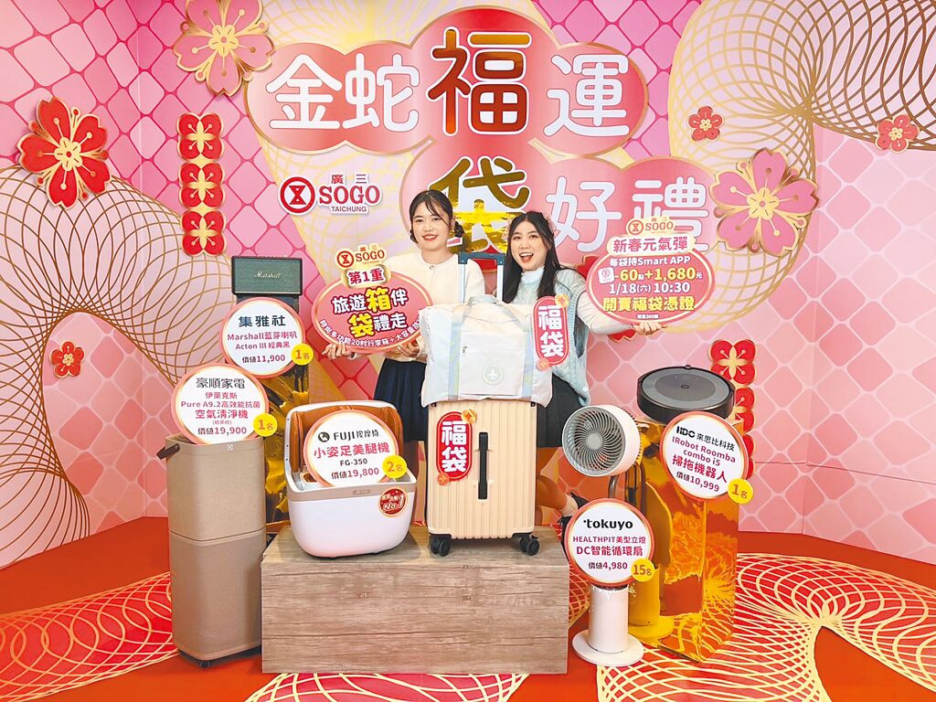 廣三SOGO推「多功能20吋行李箱+大容量旅行袋」福袋組,20吋行李箱擁有置物掛勾、行動充電、海關鎖等多功能,除了開箱有機會獲FUJI美腿機等好禮,還能抽價值12萬8000元的bgreen BR1運動養生椅;16日至2月9日亦有春節促銷,包括服飾滿3000元送紅利點數400點,大家電與特選瓷器滿萬送紅利點數2000點等,大年初一亦有「祥龍福獅賀開春」活動。