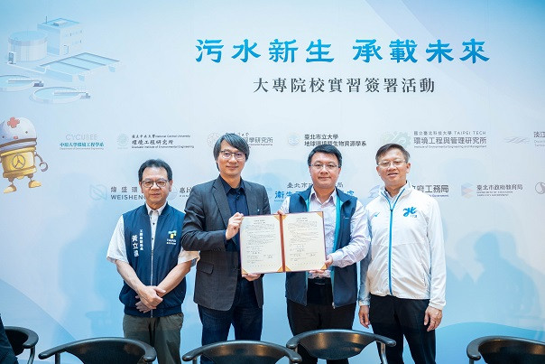 臺北市政府衛生下水道工程處今(26)日舉行「污水新生 承載未來」大專院校實習簽署典禮,工務局副局長黃立遠、教育局副局長鄧進權及國內6所大學蒞臨見證。衛工處為強化青年學子對水資源循環與環境工程的理解與實務接軌,特別規劃「污水處理廠大專院校實習計畫」,邀請國內6大具有環境工程相關學系之大學學生,利用暑假走進迪化及內湖污水處理廠實習,進行實地作業與學習,藉由污水處理操作流程、維護管理、水質實驗、環境教育等面向,達成理論的實踐,也有助於業界提前培養與延攬人才。