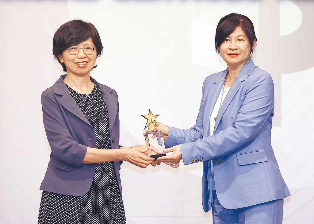 2025旺旺中時金融服務評鑑大賞頒獎典禮18日登場,金管會副主委莊琇媛(左)將金質治理獎頒贈給旺旺友聯產險副總經理蔡宛樺(右)。(范揚光攝)