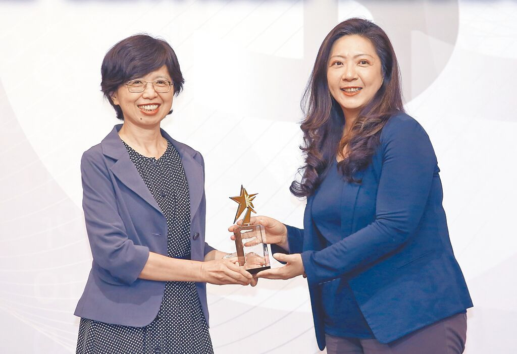 2025旺旺中時金融服務評鑑大賞頒獎典禮18日登場,金管會副主委莊琇媛(左)將永續發展獎頒贈給永豐投信行銷業務處副總經理孫詩怡(右)。(范揚光攝)