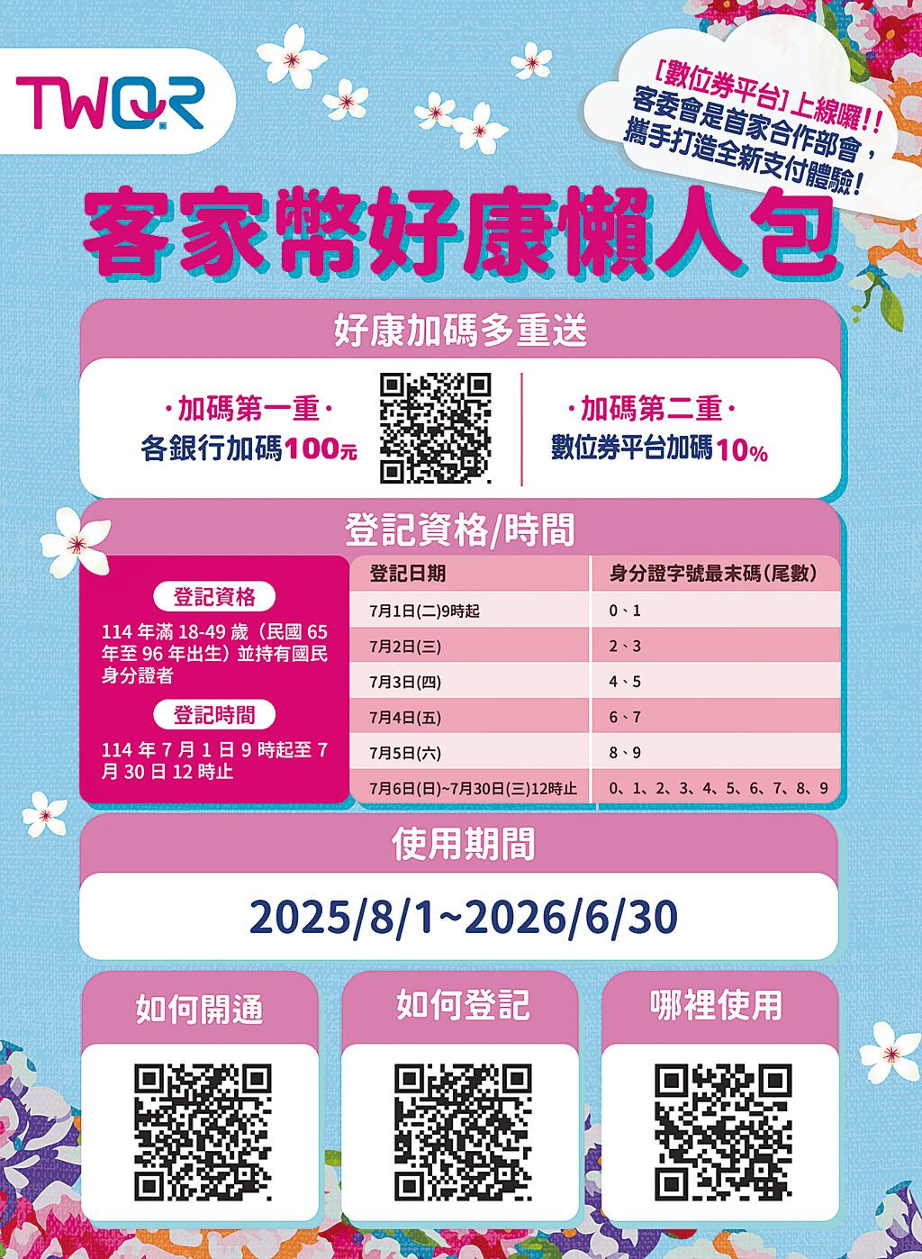 客家委員會與財金公司合作推出「客家幣」數位券,7月1日起開放18至49歲民眾透過17家金融/電支機構App登記,每人最高可領取1000元數位券,藉此優惠鼓勵民眾走入客庄、體驗客家文化,並促進在地經濟發展。