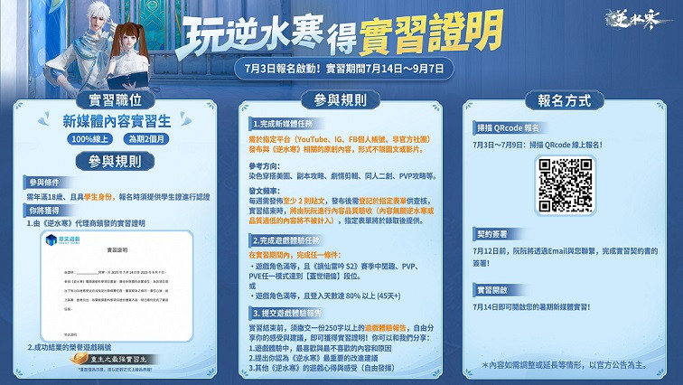 逆水寒實習制度著重「新媒體內容創作」與「遊戲深度體驗」,共分三大部分,詳情請見《逆水寒》官方社群平台。