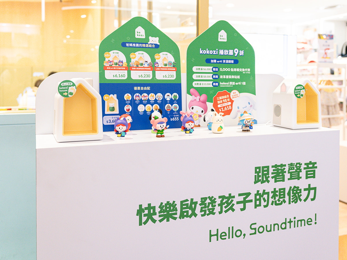 主辦單位 kokozi 更介紹 pop-up shop 四大亮點:一、現場體驗:依據孩子需求,自由搭配最適合的故事屋組合。二、限定活動:拍照打卡、完成指定任務,獲得迷你帆布手提包與折價券。三、SOGO 專屬優惠:三麗鷗明星系列享93折,再送專輯兌換代幣。四、週末限定故事場:莎拉老師與叮噹媽咪現場說故事,與孩子共創聲音魔法。
