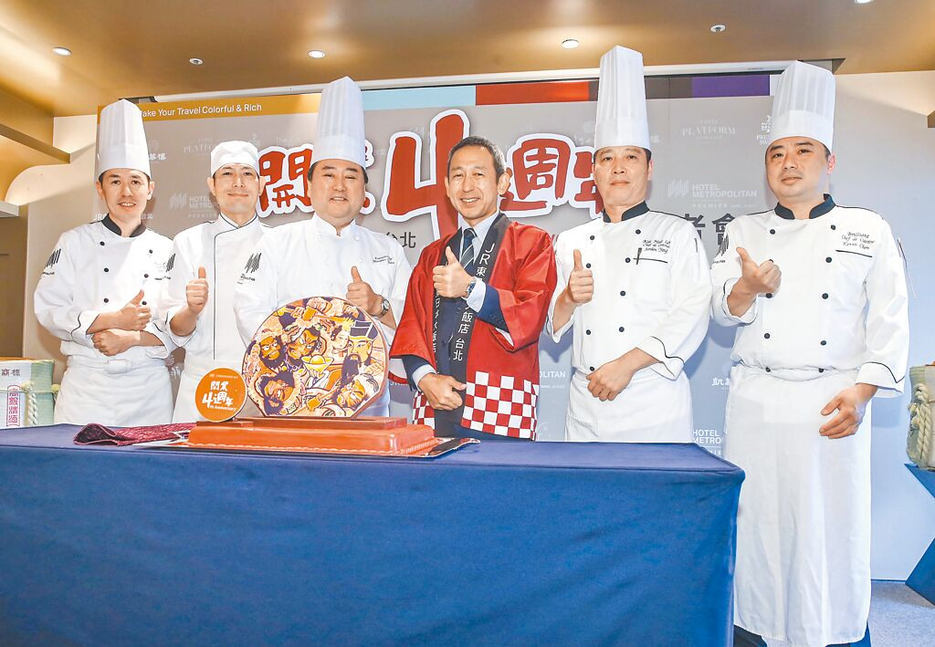 業者邀請來自日本東京車站大飯店的JR東日本集團總料理長石原雅弘(左3)領銜監製,攜手飯店主廚群策畫「4周年主題美食祭」,紅衣者為總支配人山本寬。(粘耿豪攝)