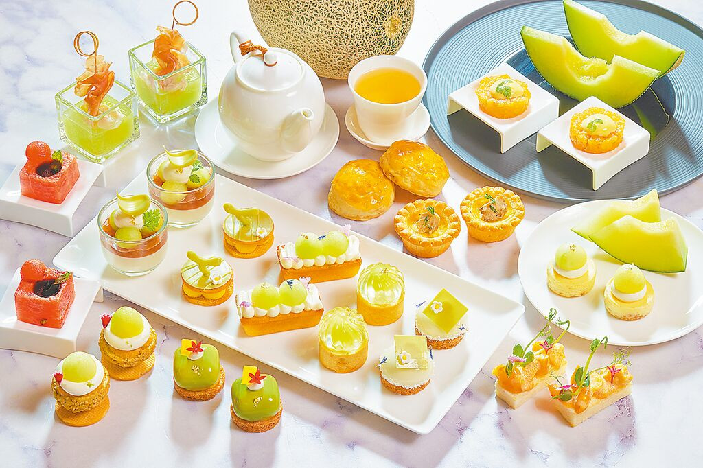 「Platform月台町」大廳酒吧推出日本山形縣庄內地區出產、甜度高且香氣濃郁的哈密瓜,共14道鹹甜點組合的「山形縣庄內產哈密瓜下午茶」。(JR東日本大飯店台北提供)