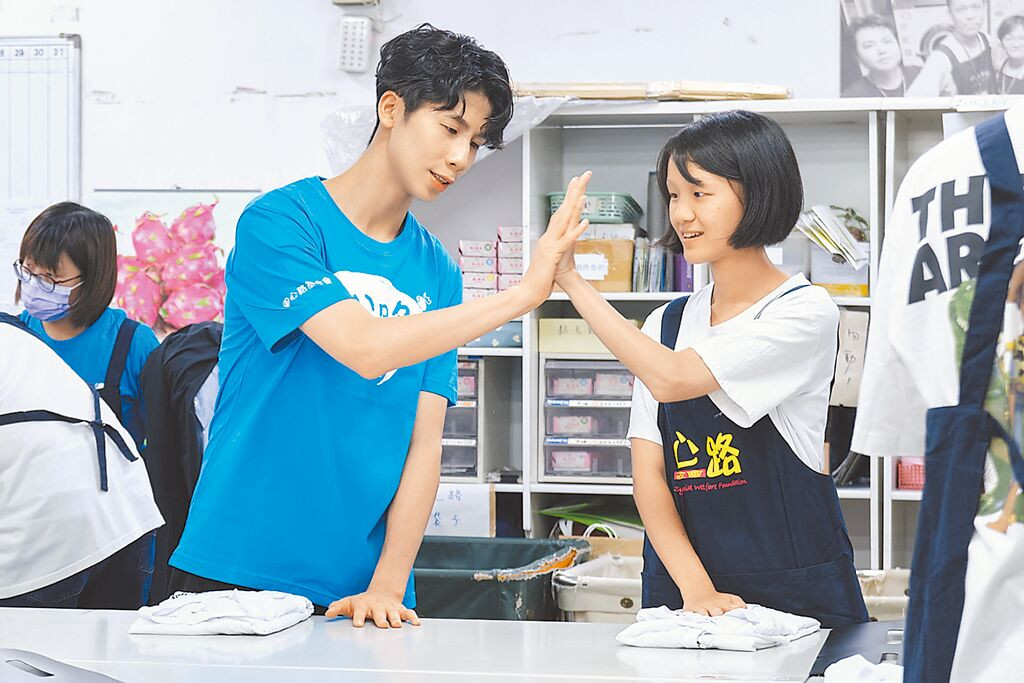台灣大運動家族奧運金牌拳擊選手林郁婷(左)在備戰期間,前往新北五股的心路基金會洗衣庇護工場,跟著庇護員工學習分類、熨燙與摺疊衣物。(台灣大提供)