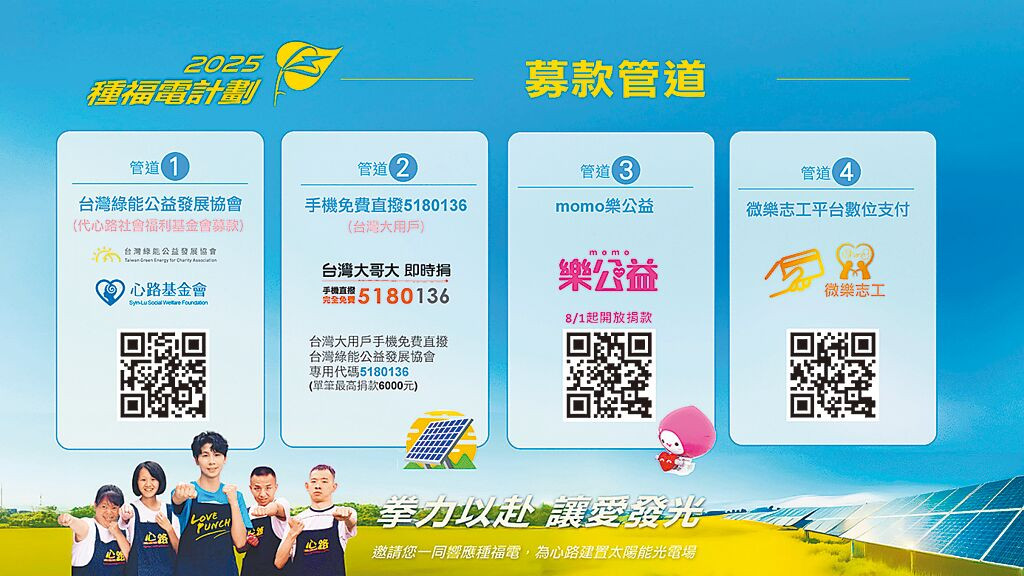 8月1日起至9月30日,民眾可透過momo購物網、台灣大用戶手機直撥「5180136」、微樂志工平台數位支付,或至「台灣綠能公益發展協會」網站進行線上捐款。社團法人台灣綠能公益發展協會:(https://twm.tw/7bGGo);台灣大用戶手機直撥5180136(單筆最高可捐6000元):微樂志工平台數位支付:(https://twm.tw/5mOcq);momo樂公益:(https://twm.tw/1fcvw)。