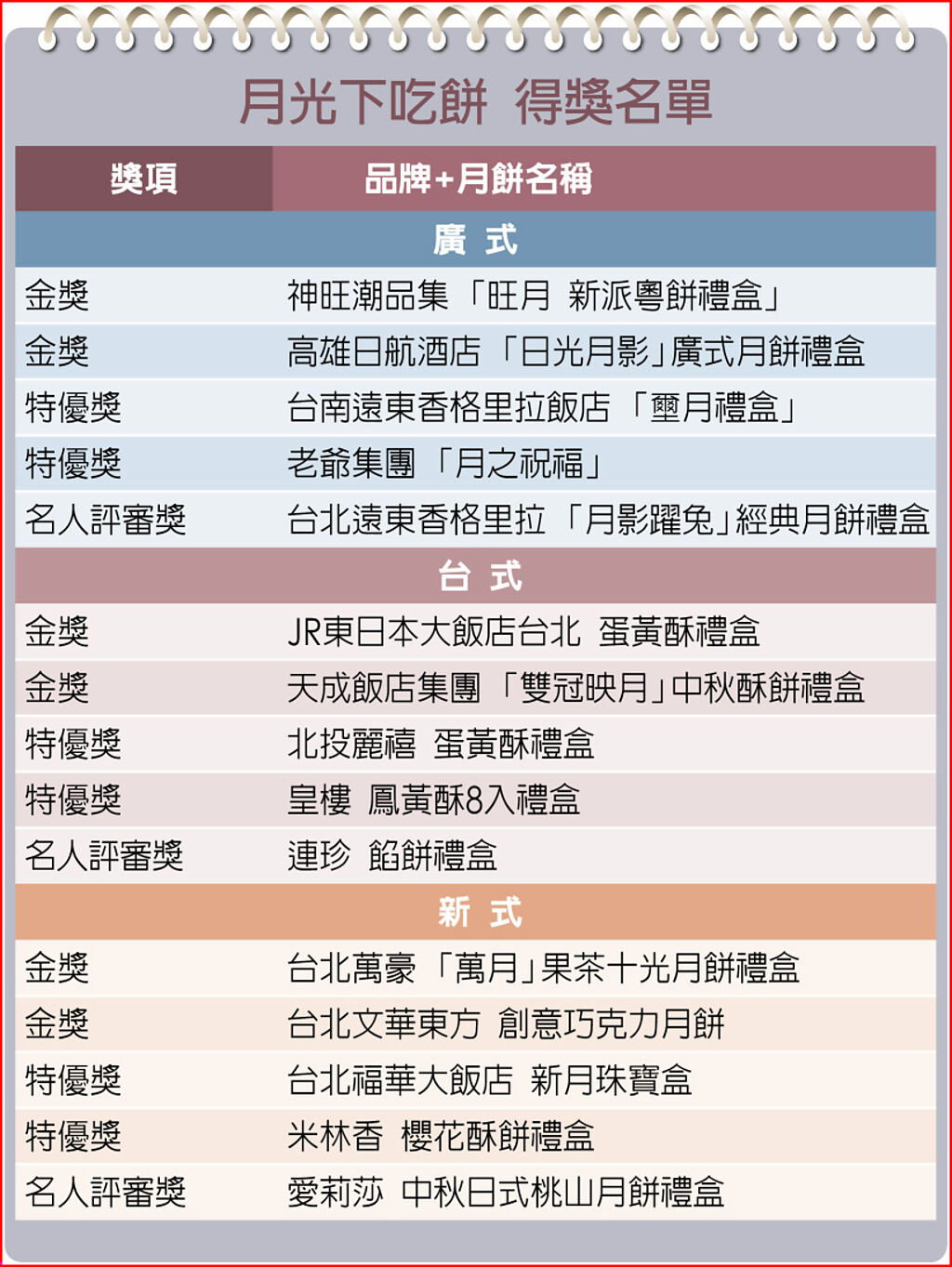 月餅評鑑獎項分為金獎、特優獎及名人評審獎,廣式月餅由神旺潮品集「旺月 新派粵餅禮盒」、高雄日航酒店「日月光影」廣式月餅禮盒獲得金獎;特優獎由台南遠東香格里拉飯店「壐月禮盒」、老爺集團「月之祝福」拿下;名人評審獎則是台北遠東香格里拉「月影躍兔」經典月餅禮盒獲得。