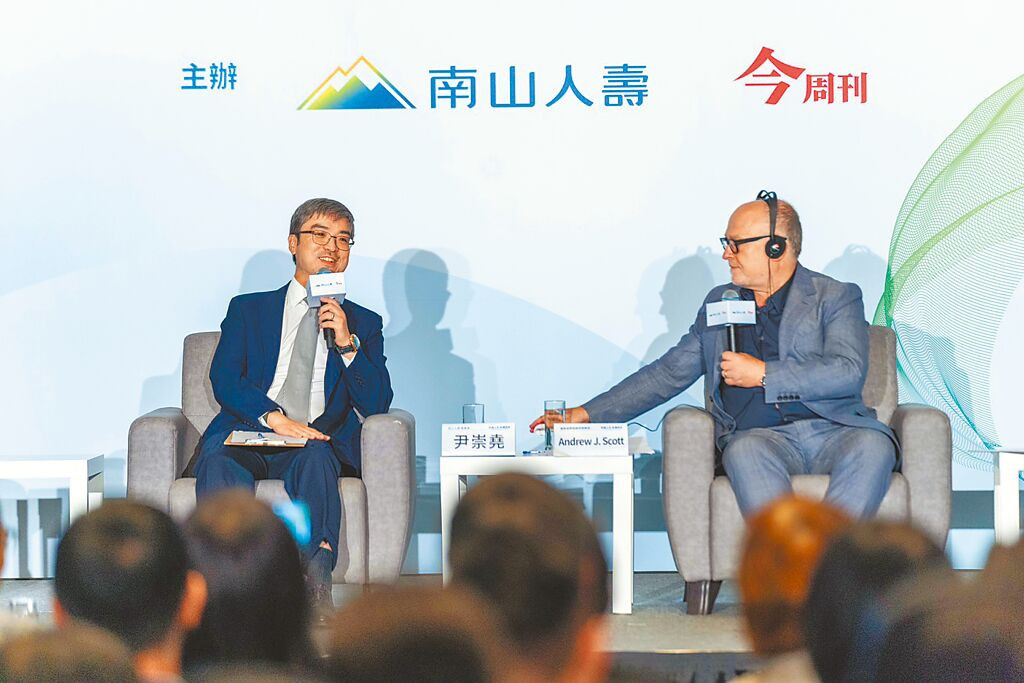 迎接百歲人生、掌握長壽紅利,南山人壽董事長尹崇堯(左)參加永續健康趨勢論壇並與現場來賓進行對談,右為倫敦商學院經濟學教授安德魯.史考特(Andrew J. Scott)。(南山人壽提供╱洪凱音台北傳真)