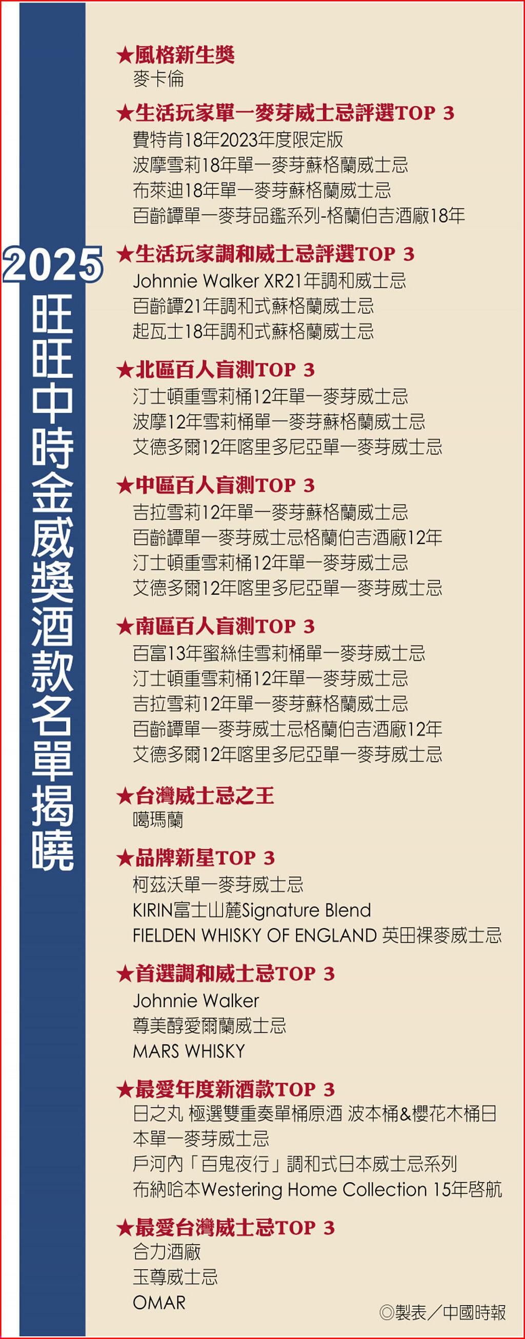 由旺旺中時集團連續舉辦3年的「金威獎」,在酒界享有「威士忌金馬獎」美譽,活動透過多元的評選方式評鑑威士忌,包括「網路投票」、「生活玩家盲測」、「北中南素人盲測」等;其中「生活玩家」場邀請8位達人擔任金威獎評審大使,他們一致認為「金威獎」摒除品牌迷思,且透過公正、客觀的投票機制選出年度TOP 3酒款,對威士忌產業有正面效益。