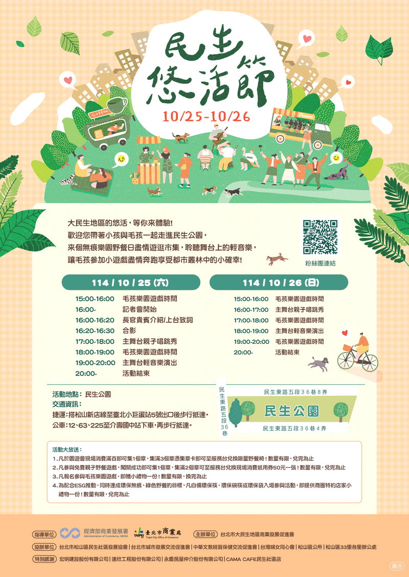 臺北市商業處輔導台北市大民生地區商業發展促進會於10月25、26日在民生公園辦理「2025民生•悠活節」活動,今年以親子、毛孩、環保為元素,現場除了有親子闖關遊戲、各式特色美食小吃及精采舞台表演外,更首度推出「毛孩樂園」,邀請毛爸毛媽帶著親愛的毛孩一起來挑戰,凡於活動現場參加闖關挑戰、或攜帶環保餐具響應ESG皆有精美小禮物可以領取,消費滿額再送限量野餐椅。臺北市產業發展局專委許維倫表示,民生社區是全臺首座「美式住宅示範區」,在市府及在地民眾長期努力的維護下,始終保持著它獨有的韻味及樣貌,不僅街道井然有序、環境清幽、綠樹林立、生活便捷,靜謐悠閒的環境更吸引許多文青小店進駐,在城市繁忙步調中是鬧中取靜、不可或缺的一塊綠地。為協助在地店家活絡發展,形塑商圈特色,市府每年透過臺北市提振商圈發展補助計畫,鼓勵本市商圈以創新、多元方式展現商圈特色,自111年起持續補助台北市大民生地區商業發展促進會自主辦理活動,讓民眾一起走進城市綠地,感受大民生地區的悠活與「慢哲學」。
