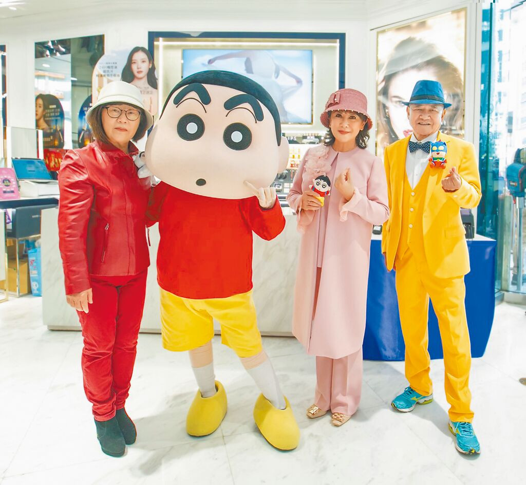 遠東SOGO董事長黃晴雯(右二)與行政總經理杜金森(右一)、營業總經理吳素吟(左一)與來店禮IP蠟筆小新一同開店迎賓。(SOGO提供)