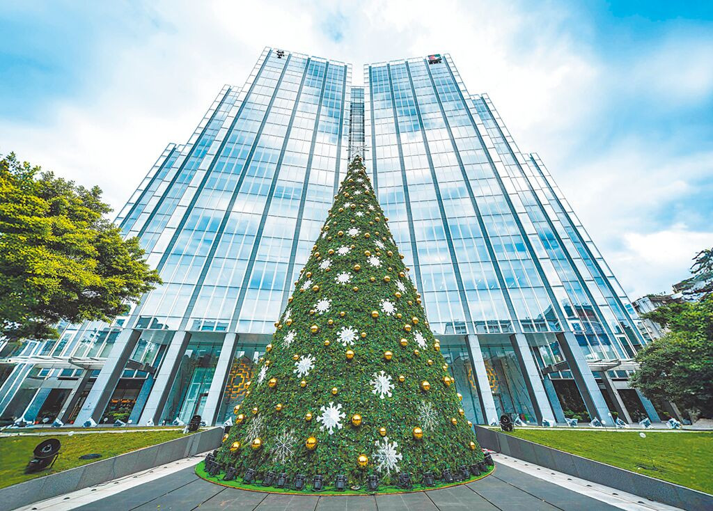 凱基金控總部大樓廣場立起全臺最高飄雪聖誕樹,舉辦一系列節慶活動,打造歲末最美節慶體驗。(凱基提供)