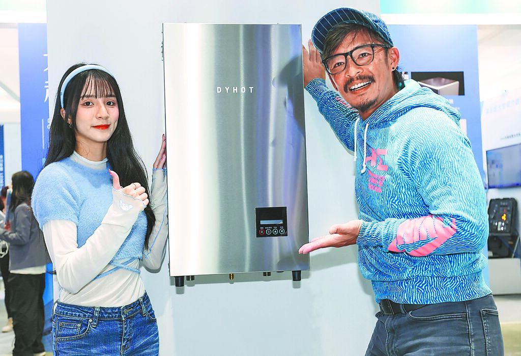 東湧董事長吳和臻(中)親自發表最新節能系統,藍波老師(右)與女兒潔潔也現身實證熱水器效能,並熱跳「馬年加碼溫暖舞」應援。(陳俊吉攝)