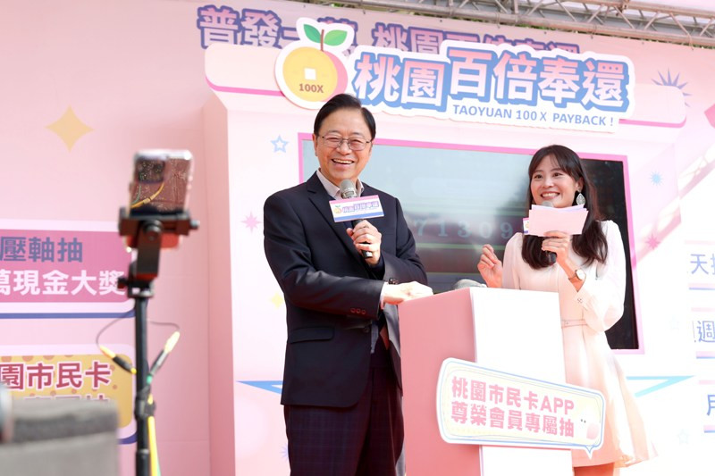桃園市「普發一萬桃園百倍奉還」活動今(9)日舉辦壓軸的百萬抽獎,在律師見證下由市長張善政抽出「壓軸百萬現金獎」及「桃園市民卡APP尊榮會員專屬抽」獎項,抽獎過程透過網路直播。此次活動共有超過240萬張發票登錄、消費總金額逾新台幣20億元,在為期50天的活動期間,串聯桃園在地觀光工廠與重點商圈,成功引導人潮走入商圈與工廠,擴大消費效益,活絡在地經濟。