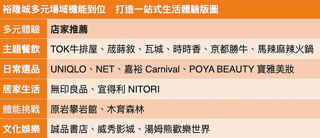 裕隆城標榜購物、餐飲、文化與休閒活動在同一場域發生,讓人自然地回到實體空間,找到貼近需求的生活節奏,館內結合誠品生活、威秀影城,更有裕隆旗下台元紡織打造的創新餐飲,包括「荿蒔敘」火鍋以及近期開張的「TOK牛排屋」,同時鎖定親子家庭客層引進無印良品、宜得利等品牌,一次滿足美感與生活機能選擇,成功打造百貨差異化亮點。
