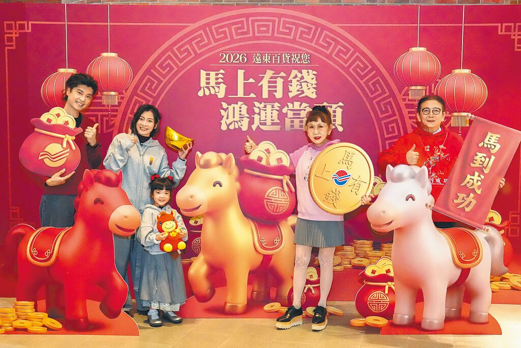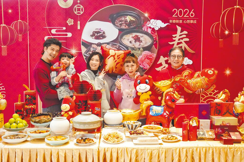 遠東百貨徐雪芳總經理(右二)、商品二部陳佑任副總(右一)嚴選2026春節禮品專刊,年菜和伴手禮都是優質選,網紅羅小白全家人搶先品嘗。(遠百提供)
