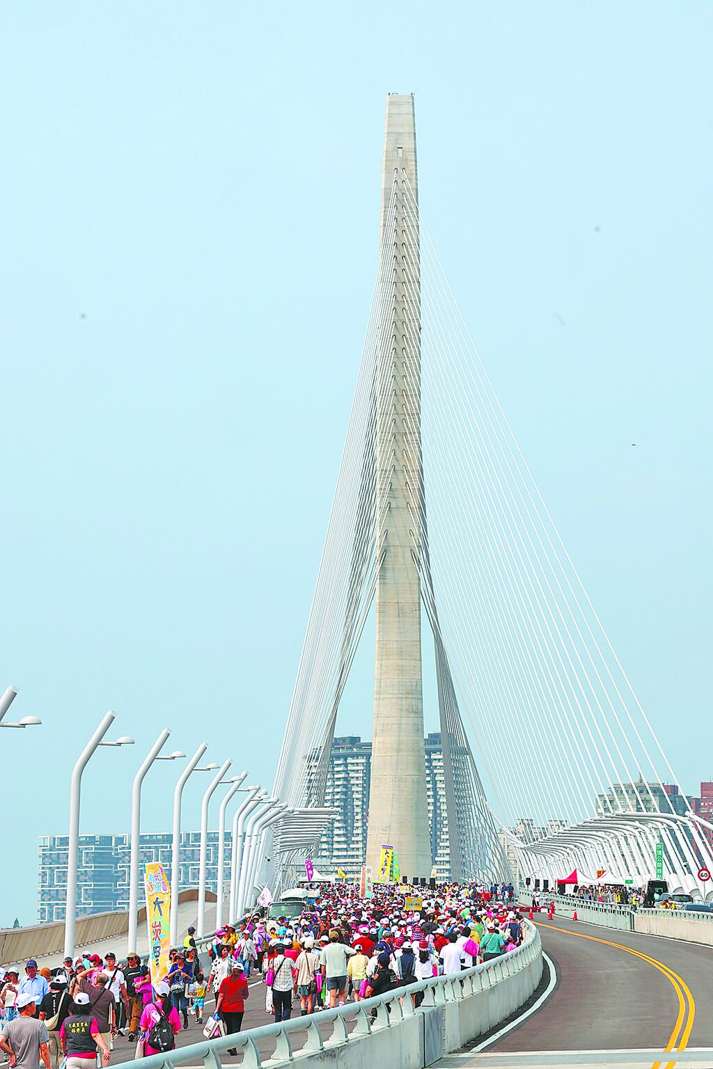 淡江大橋17日下午舉辦通車前首場暖身活動「淡水八里.橋見未來」,吸引上萬名市民登橋參與。(鄧博仁攝)