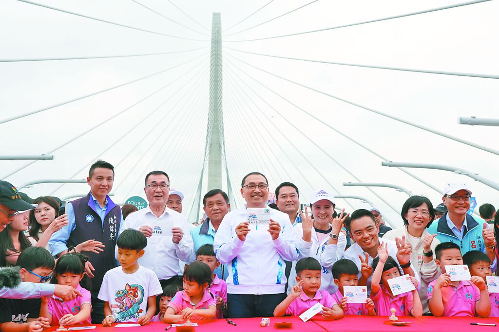 淡江大橋17日下午舉辦通車前首場暖身活動「淡水八里.橋見未來」,新北市長侯友宜(前排中)與幼兒園學童在紀念明信片上寫下心願、蓋上專屬戳章投入郵筒,寄託對未來的憧憬。(鄧博仁攝)