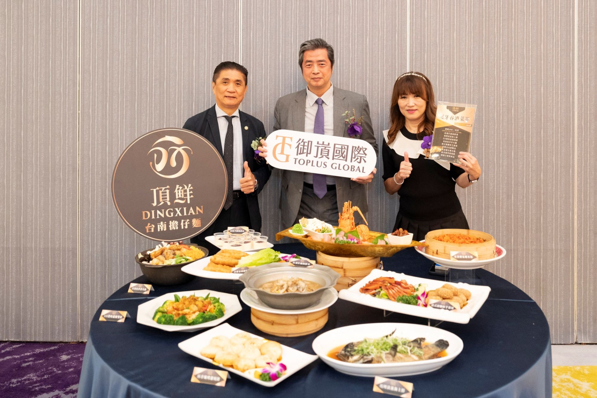 頂鮮推出「尾牙春酒專案」,主打現撈高級海鮮與澎湃桌菜饗宴,每桌8,888元起。御嵿國際董事長孫正強(左二)、副董事長李日東(左一)、頂鮮擔仔麵高雄自強店副總孔秀玲(左三)