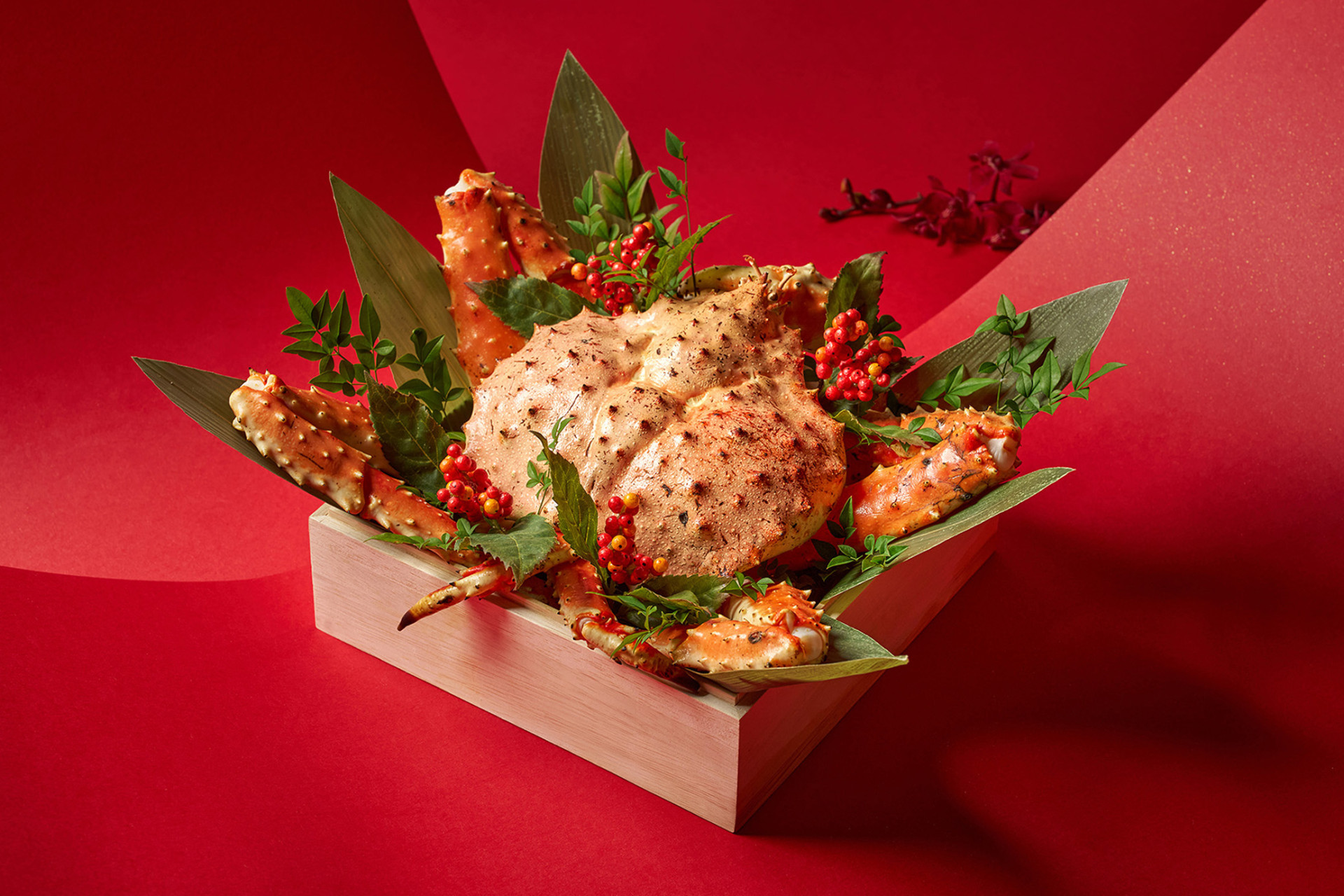 晴山餐廳選用日本進口鮮活漁獲推出多道海味年菜,有冬季盛產的「鱈場蟹」,以炭火烤至蟹味香濃,新春年節整隻豪氣上桌。