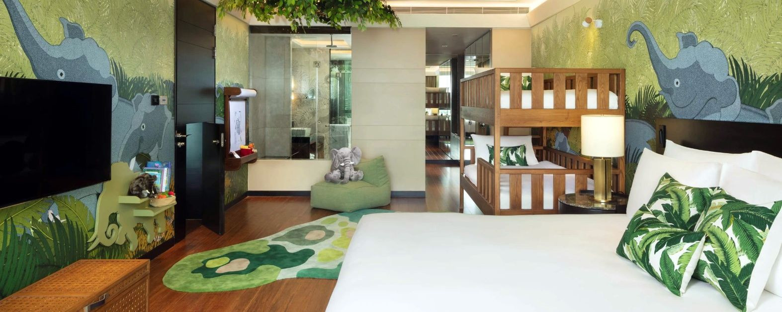 曼谷暹羅凱賓斯基的單臥室動物主題套房,最近迎來了重量級新成員——大象主題套房。由才華洋溢的泰國藝術家親自操刀,透過細膩的牆面手繪與創意技巧,將森林生態栩栩如生地展現在孩子眼前。