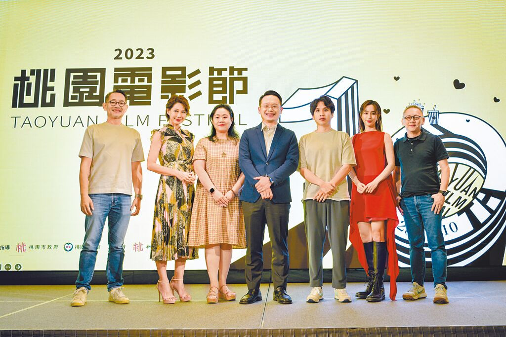 《倒數回擊》製片楊中天(左起)、丁寧、編劇林珮瑜、桃園副市長蘇俊賓、導演洪子烜、温貞菱、出品人楊志光合影。(桃園電影節提供)